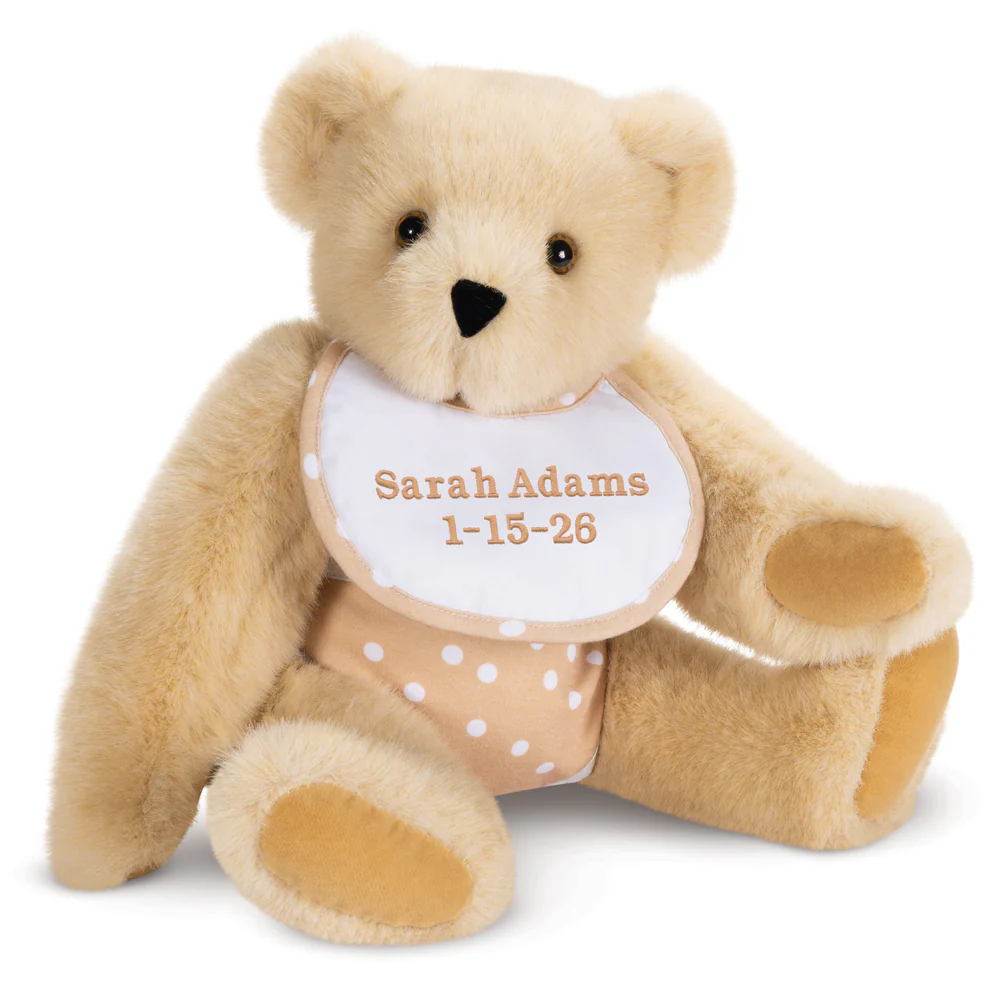 For baby boys, baby girls and all babies who love Teddy Bears this cuddly baby gift is made with child-safe eyes and hypoallergenic, flame-resistant fur that is washable. This precious, handcrafted in Vermont, fully jointed Teddy Bear comes dressed in an oatmeal-colored, polka-dot diaper, and personalizable bib with coordinating trim. Great for baby shower gifts and truly a wonderful way to welcome a new life, it is filled with stuffing made from 100% recycled plastic bottles and backed by a lifetime guarantee.