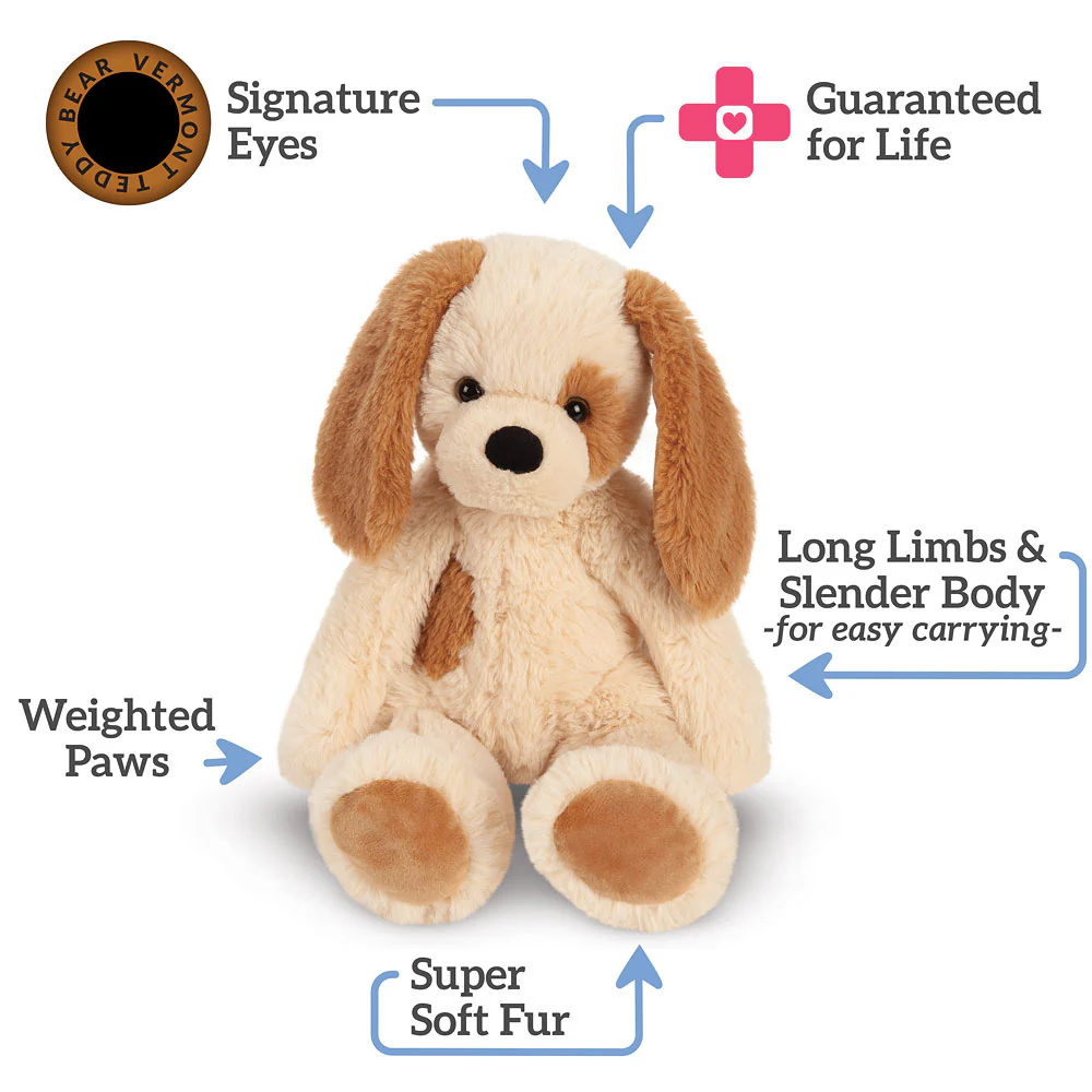 Buddy Puppy is a child's loyal companion and best friend for life. His long limbs make him easier to carry around, and we put a few weighted pellets in his paws to make him super snuggly. With long, floppy dog ears and a happy tail, he's adorable as he is huggable. Kids love his playful eye spot and short, super soft fur great for hugging. A tag below the tail has space for a name and info so Puppy will always find the way home if accidentally left behind. Guaranteed for life.